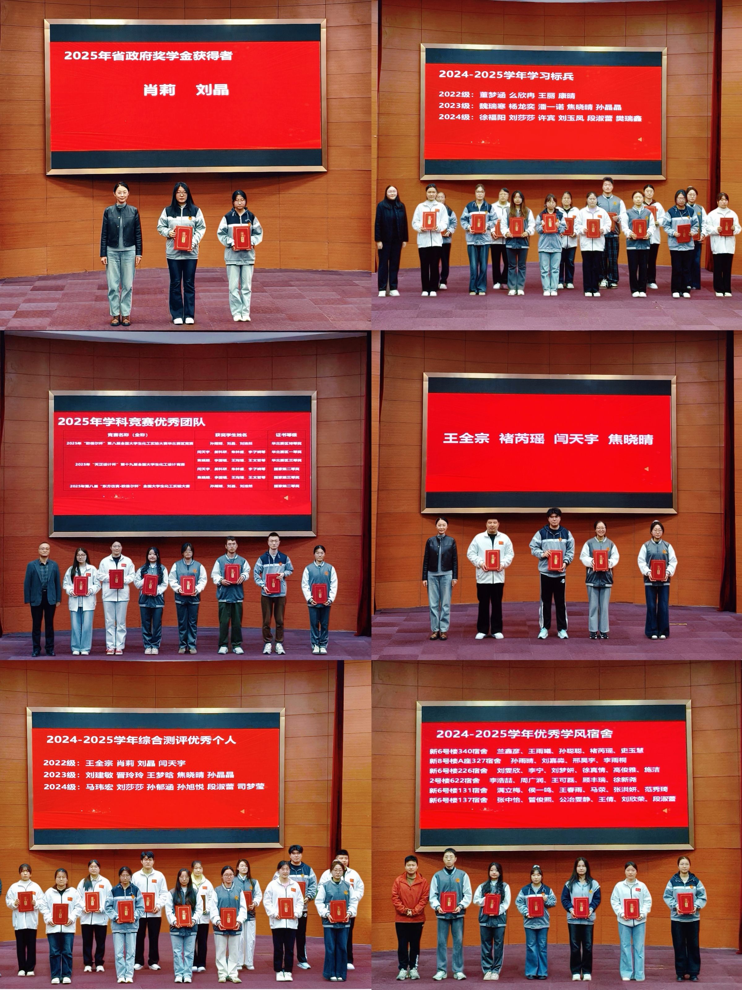 会议表彰2024-2025学年综合测评优秀个人、学习标兵,优秀学风宿舍、优秀学风班级,以及在学科竞赛中表现突出的优秀个人及团队、省政府奖学金获得者和国家奖学金推荐人选。与会领导老师为获奖集体和个人颁发荣誉证书。