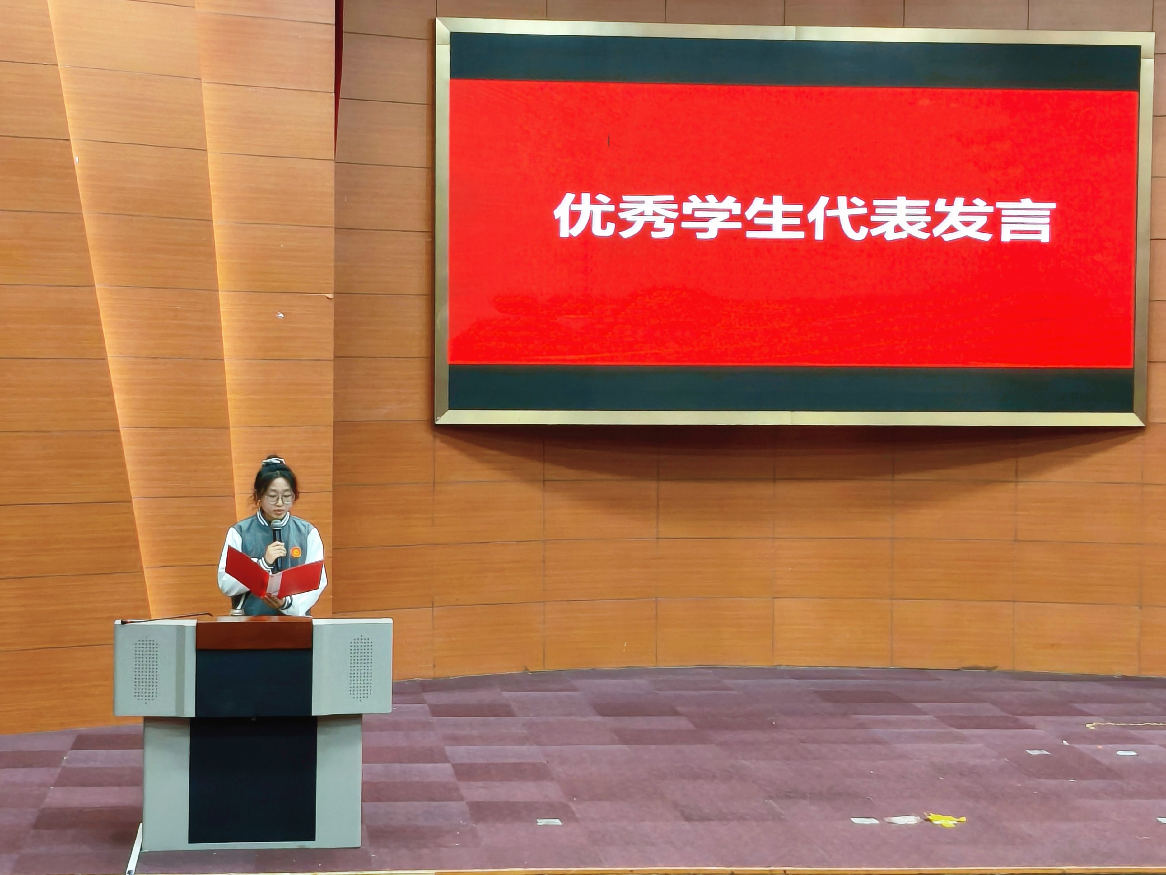 获奖学生代表焦晓晴发言。她结合自身专业学习经历与参与学风建设的实践感悟,从“制定科学学习计划”、“参与科研创新实践”及“带动宿舍学习氛围”三个方面分享经验,鼓励同学们以“勤”为舟、以“实”为帆,主动融入学院学风建设,在互助共进中提升综合素养。