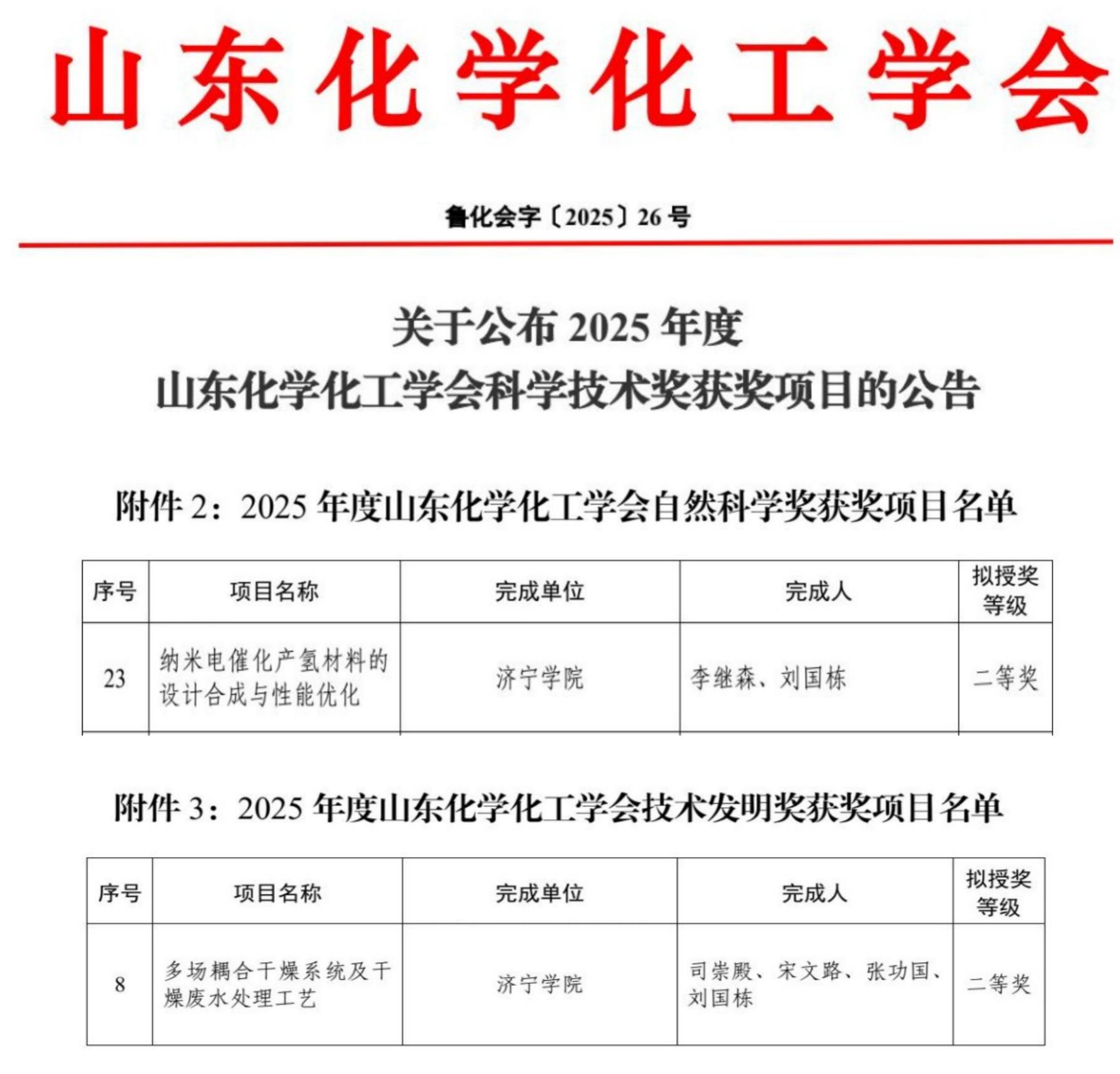 近日,2025年度山东化学化工学会科学技术奖评选结果揭晓,我校化学化工与材料学院凭借在基础研究与应用开发方面的突出贡献,获评自然科学奖与技术发明奖各一项,实现高质量科研成果的双丰收,彰显了学校在化学化工学科领域的深厚积淀与强劲实力。