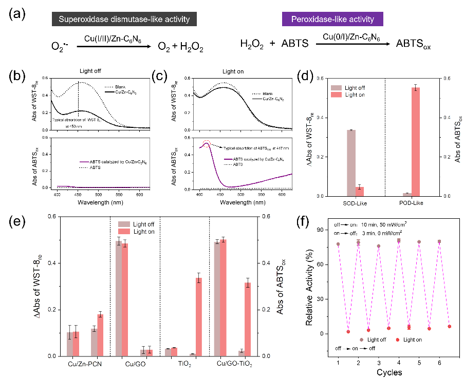 鉴于此,济宁学院青年教师洪卿和东南大学张袁建教授团队合作报道了一种铜/锌双单原子纳米酶(Cu/Zn-C6N6)。如图1所示,Cu/Zn-C6N6在无光条件下具有优异的类超氧物歧化酶(SOD)活性,还能够在光照下高效地可逆切换成独特的类过氧化物酶(POD)活性。这一切换性能明显高于其对照实验,包括具有和Cu/Zn-C6N6类似Cu/Zn-Nx配位中心的含Cu/Zn纳米酶、光催化剂和它们的混合物。此外,通过交替的光照,SOD和POD活性之间的可逆转换效率超过90%以上,比光敏小分子的顺式和反式异构体之间的切换效率还要高30%。