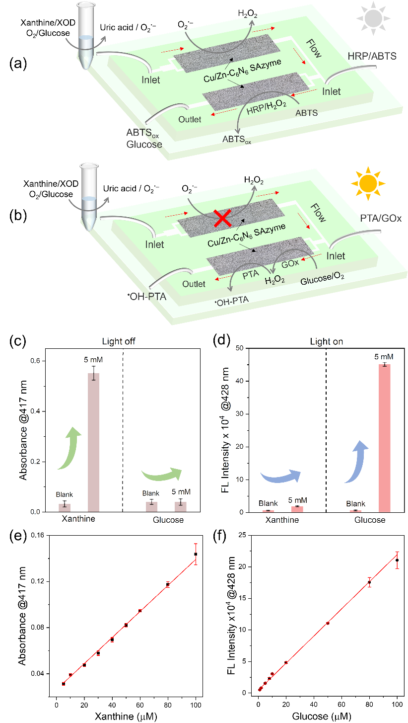 基于Cu/Zn-C6N6SAzyme的多功能可逆切换能力,该团队将其成功应用于单界面智能切换生物传感,通过简单的交替光照,在微流控反应器中实现了葡萄糖和黄嘌呤体外可逆切换检测(图3),线性检测范围分别为5-100μm和1-100 μm。