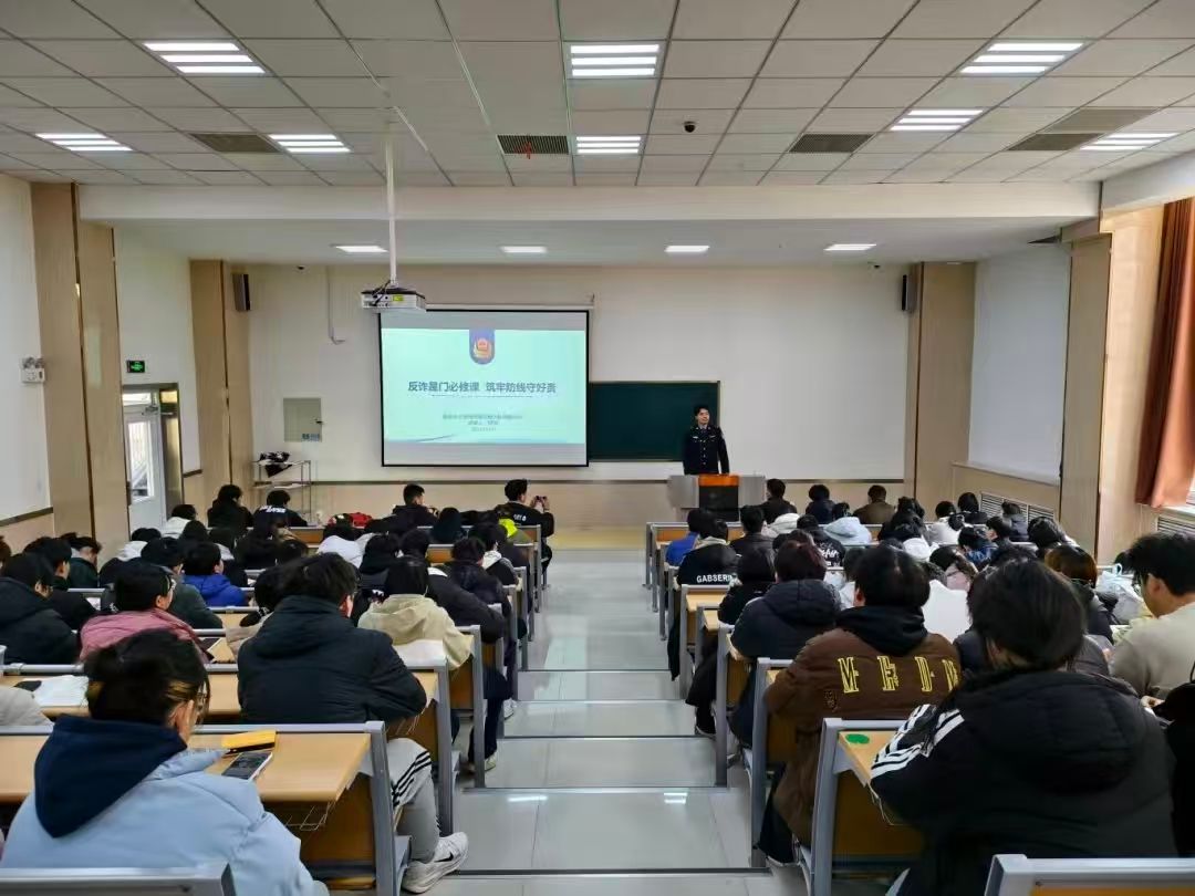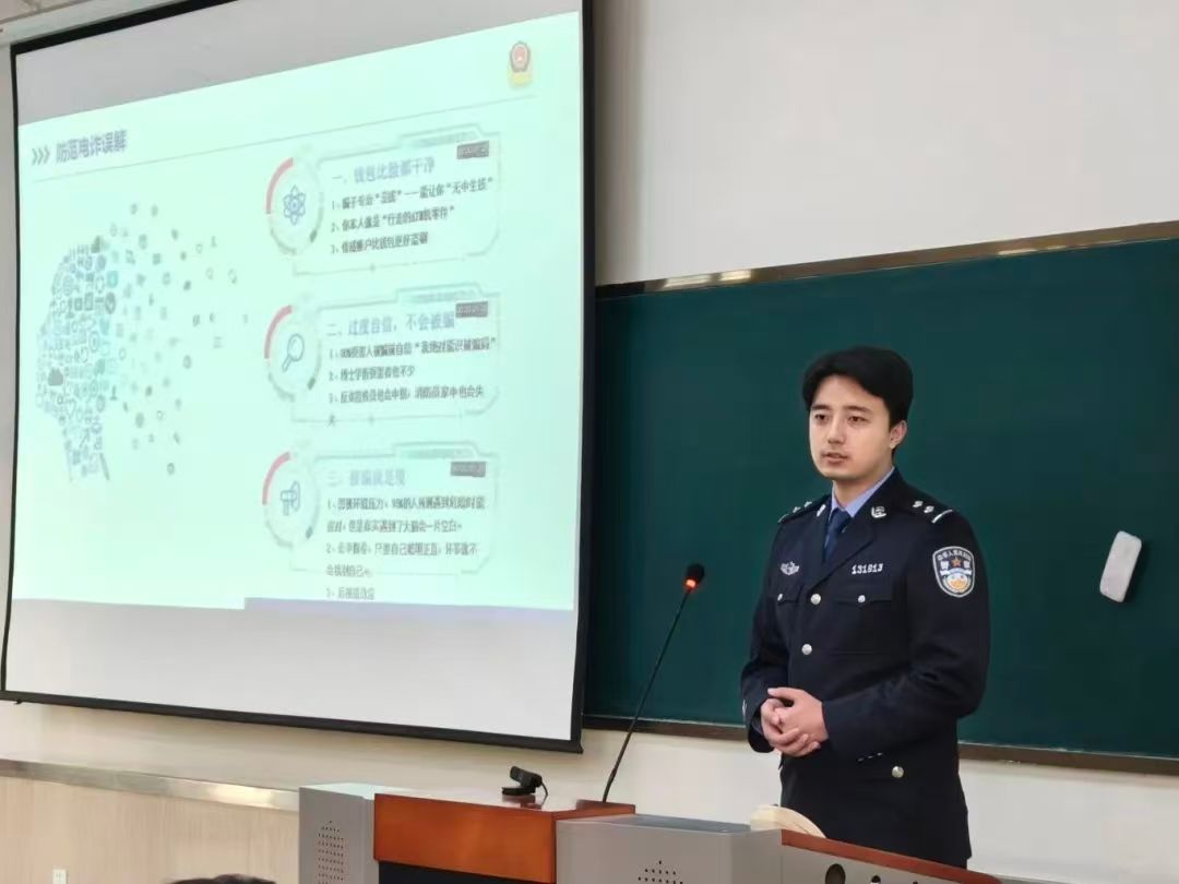 活动现场,程鸣警官结合真实案例,详细讲解了电信诈骗的常见类型、套路以及识别技巧,澄清了大家对“电诈”的认识盲区和误区。现场播放了被诈骗相关视频,直观展现了诈骗分子的作案过程,以及民警成功干预诈骗的真实画面,让同学们更深刻地感受到诈骗的危害性和提高防范意识、能力的重要性。程鸣警官还分享了近期发生在身边的诈骗案例,用“身边事”警示“身边人”,引导大家在遇到可疑情况时保持冷静,做到“不听、不信、不转账”,遇到问题及时向辅导员反映,在老师指导下拨打反诈热线或向警方求助。